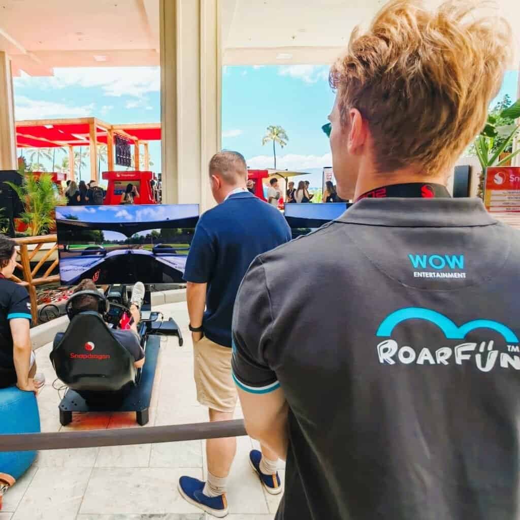 We usually discuss details with the client before an event and adjust the experience length based on the expected quantity of participants, schedule, and event concept. One try can be as short as 3 minutes, with 1-2 minutes to change players. The recommended time is 6-8 minutes per try, with 2-3 minutes in between to change a player and explain the controls. RoarFun entertainment is excellent for kids, youth and adults, but time per try would vary based on the visitor’s experience.